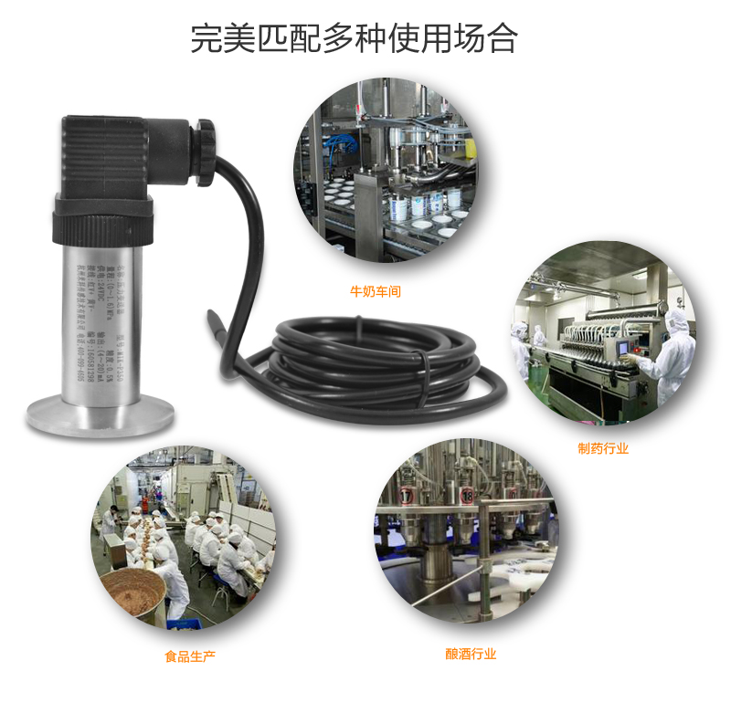 MIK-P350系列平面膜結(jié)構(gòu)壓力變送器選用德國(guó)進(jìn)口擴(kuò)散硅芯體,采用平面膜直接感受壓力。傳感器接口有卡箍式,M27×2,法蘭式可供選擇。輸出信號(hào)有電壓、電流、頻率信號(hào)等可選擇,傳感器平膜片防止了結(jié)垢,不衛(wèi)生及粘稠液體堵塞等問(wèn)題。廣泛應(yīng)用于食品、醫(yī)藥、衛(wèi)生及釀酒工業(yè)等部門。