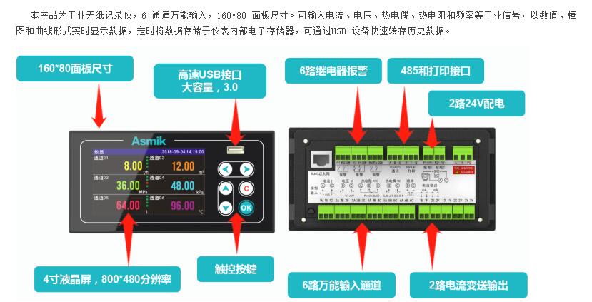 本產(chǎn)品為工業(yè)無(wú)紙記錄儀,6 通道萬(wàn)能輸入,160*80 面板尺寸。可輸入電流、電壓、熱電偶、熱電阻和頻率等工業(yè)信號(hào),以數(shù)值、棒圖和曲線形式實(shí)時(shí)顯示數(shù)據(jù),定時(shí)將數(shù)據(jù)存儲(chǔ)于儀表內(nèi)部電子存儲(chǔ)器,可通過(guò)USB 設(shè)備快速轉(zhuǎn)存歷史數(shù)據(jù)。