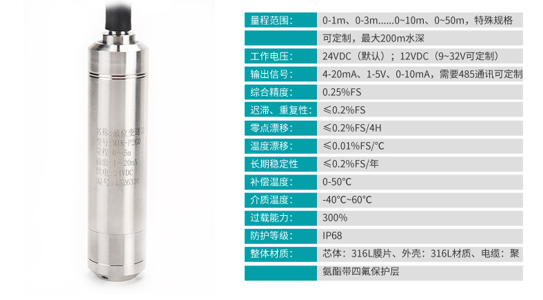 適用場(chǎng)合:投入式液位變送器是基于所測(cè)液體靜壓與該液體高度成正比的原理,采用擴(kuò)散硅或陶瓷敏感元件的壓阻效應(yīng),將靜壓轉(zhuǎn)成電信號(hào)。經(jīng)過溫度補(bǔ)償和線性校正。轉(zhuǎn)換成4-20mADC標(biāo)準(zhǔn)電流信號(hào)輸出。投入式液位變送器的傳感器部分可直接投入到液體中,變送器部分可用法蘭或支架固定,安裝使用極為方便。